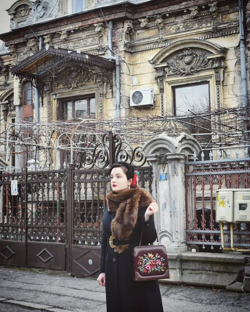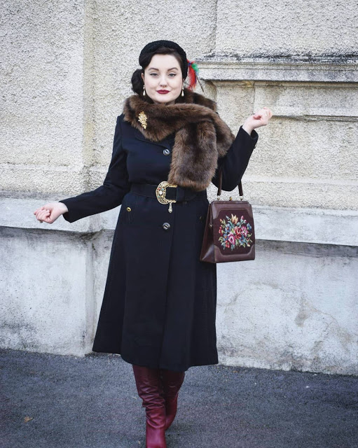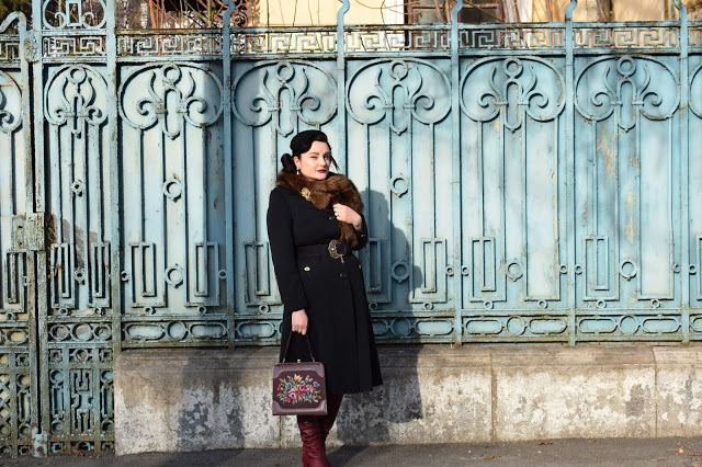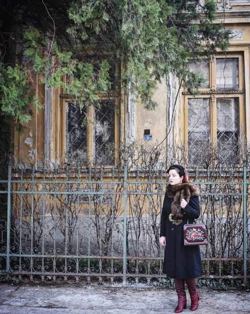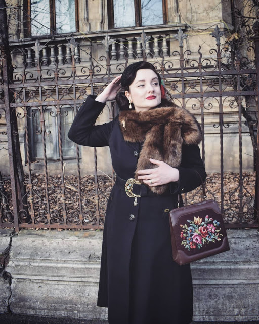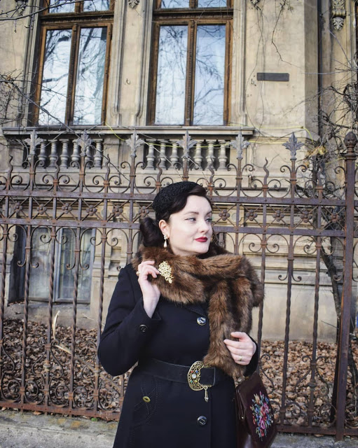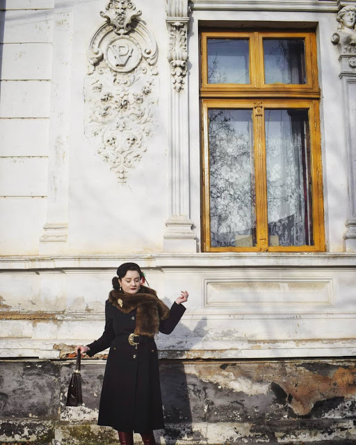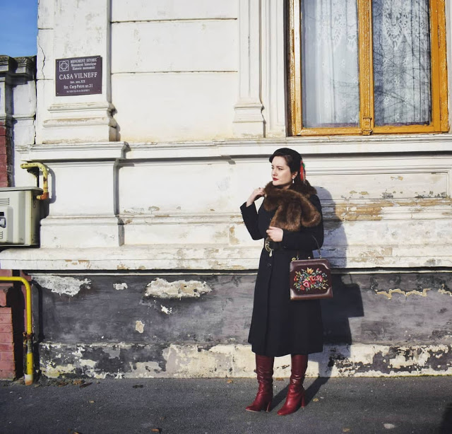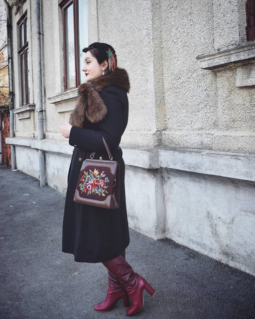 Acum câteva duminici, într-o zi cu soare de februarie și cu ceva timp liber de mobilizare la dispoziție m-am apucat să compun și să pozez într-un outfit pe care îl aveam de mult timp în cap. Totul a pornit de la accesorii de data aceasta, și mai exact de la pălăria – toca din astrahan pentru cap – și cureaua tip centură pentru talie, ambele vintage găsite în SH. Pe lângă acestea, am mai adăugat un pardesiu bluemarin, o geantă din piele cu goblen tot vintage și ele, o pereche de cizme burgundy până la genunchi și un guler de blană artificială, ambele noi de la Zara. Bijuteriile folosite au fost o pereche de cercei vintage cu perlă, un inel prețios cu piatră roșie al mamei, o broșă vintage cu perluțe și o broșă din pene facută de mine special pentru pălării.