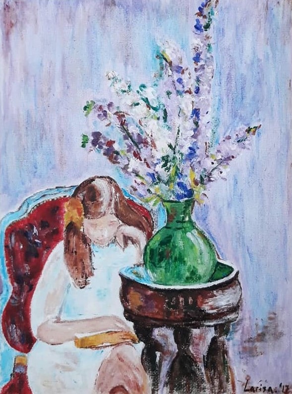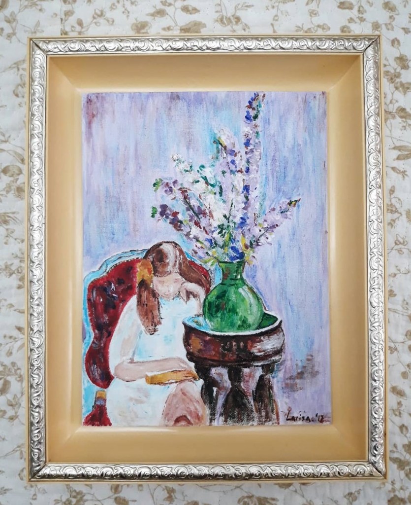 De mică am fost îndrăgostită de primăvară și de tot ceea ce reprezintă acest anotimp: soare și căldură, culorile și parfumul florilor, renașterea naturii din amorțeala și hibernarea iernii. Așa că mi-a venit foarte firesc ca următoarea mea încercare de a picta pe pânză să fie o reinterpretare a tabloului “Girl with flowers” (Henri Lebasque, circa 1909).