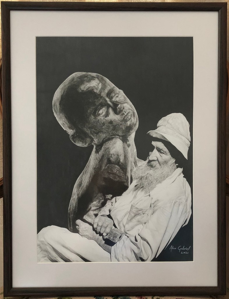 “Am stat destul de mult ca să îl fac doar pe el, adică prima jumătate din desen, pentru că foloseam grafit, iar pentru trecerile alea fine am folosit h-uri, care nici nu strică printr-un luciu prea evident. A fost nevoie să am și grijă pentru că în cazul unor umbre mai tari treabuia să schimb cu altceva ca să nu lucească desenul prea tare. L-am terminat în ultimele 2 zile înainte de data limită a înscrierii la concurs pentru că am zis să schimb și să folosesc cărbuni în continuare, că altfel însemna că degeaba am stat ca să fac acel desen.“